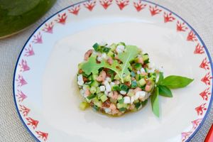 Petit tartare de tomates à l’avocat et ses crevettes impériales vapeur